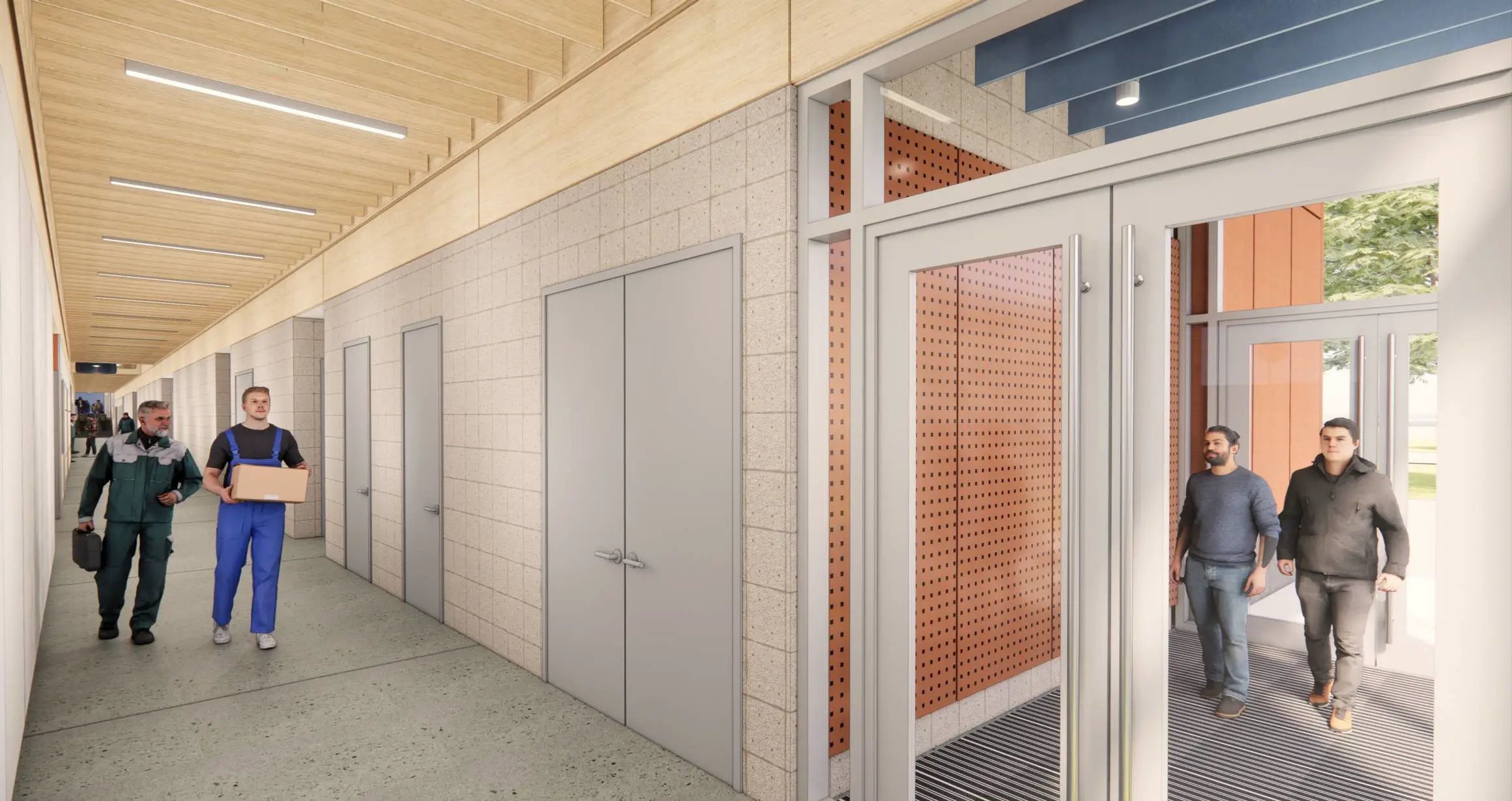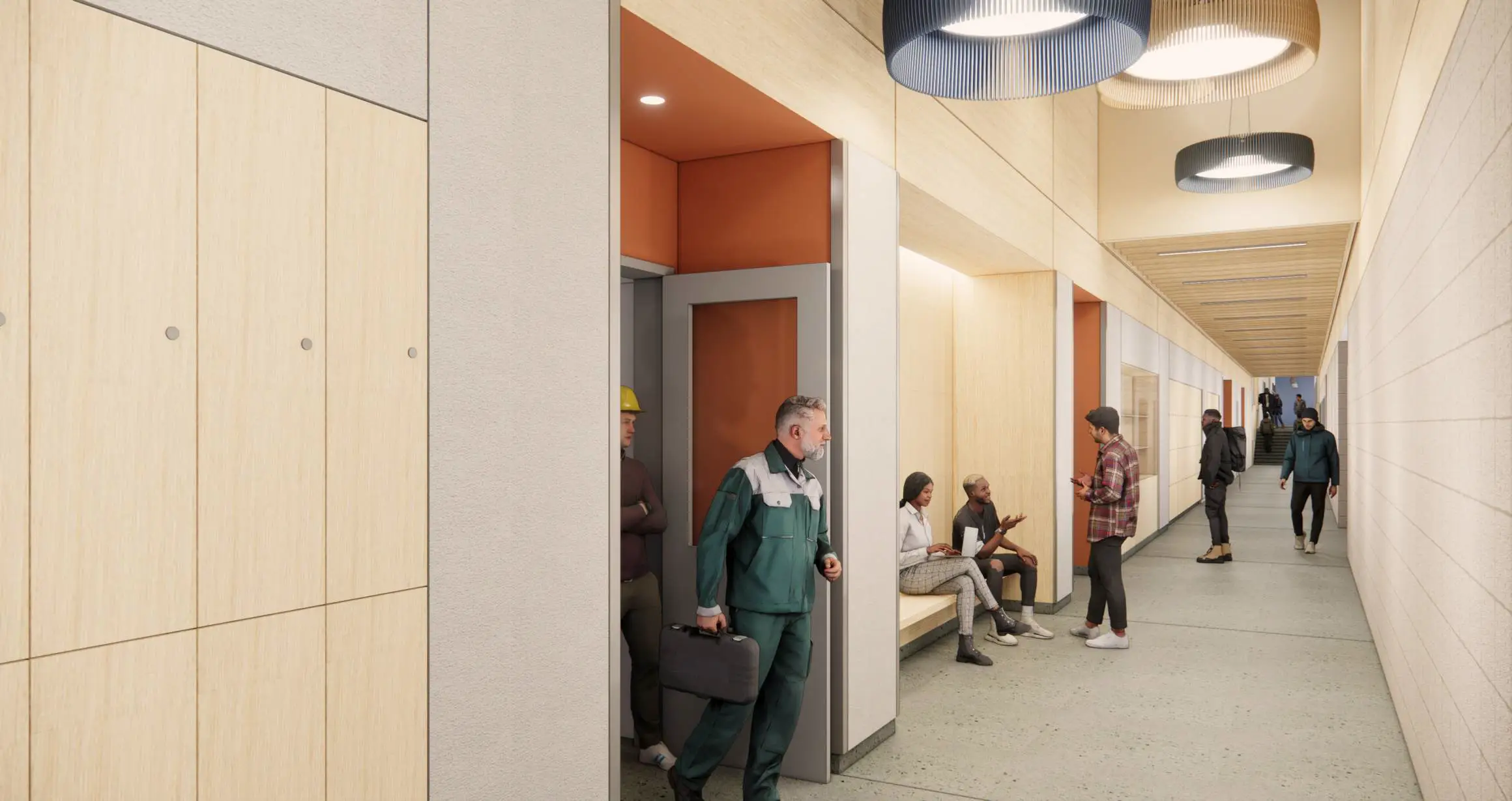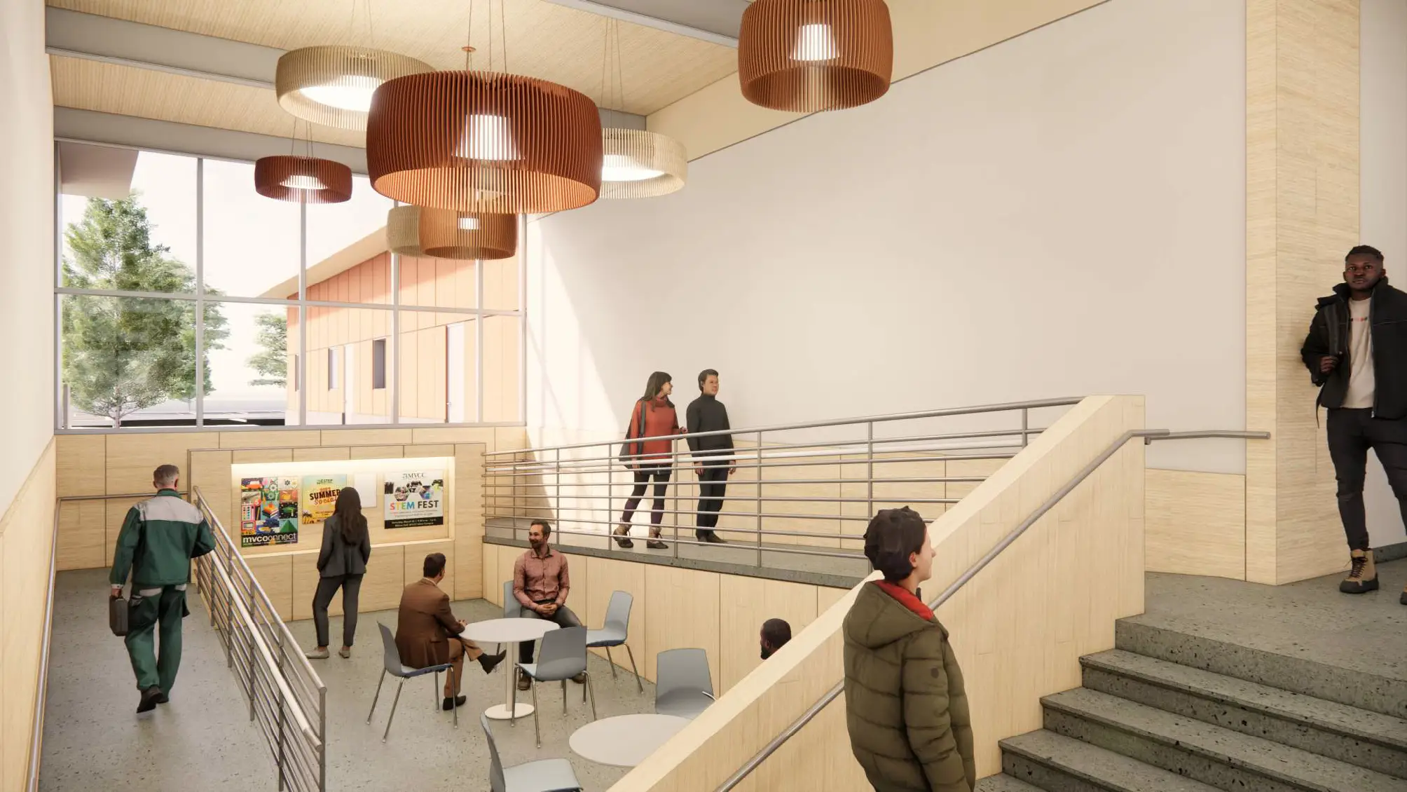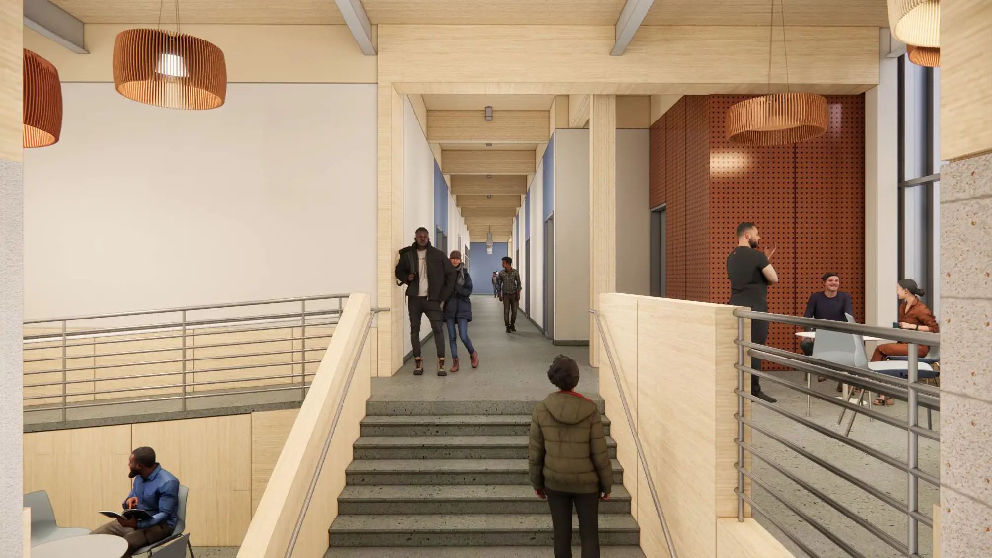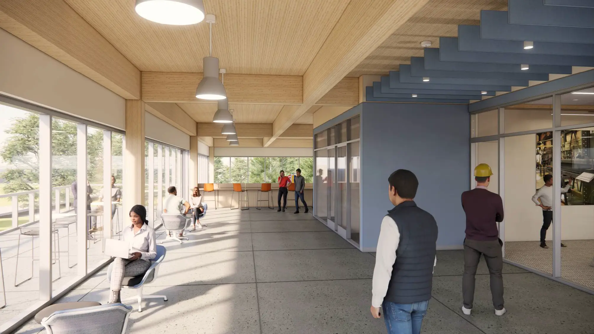 Double-height lobby with dramatic feature stair, glassfront labs, and connection between mass timber "head" and steel-framed "shed" section.