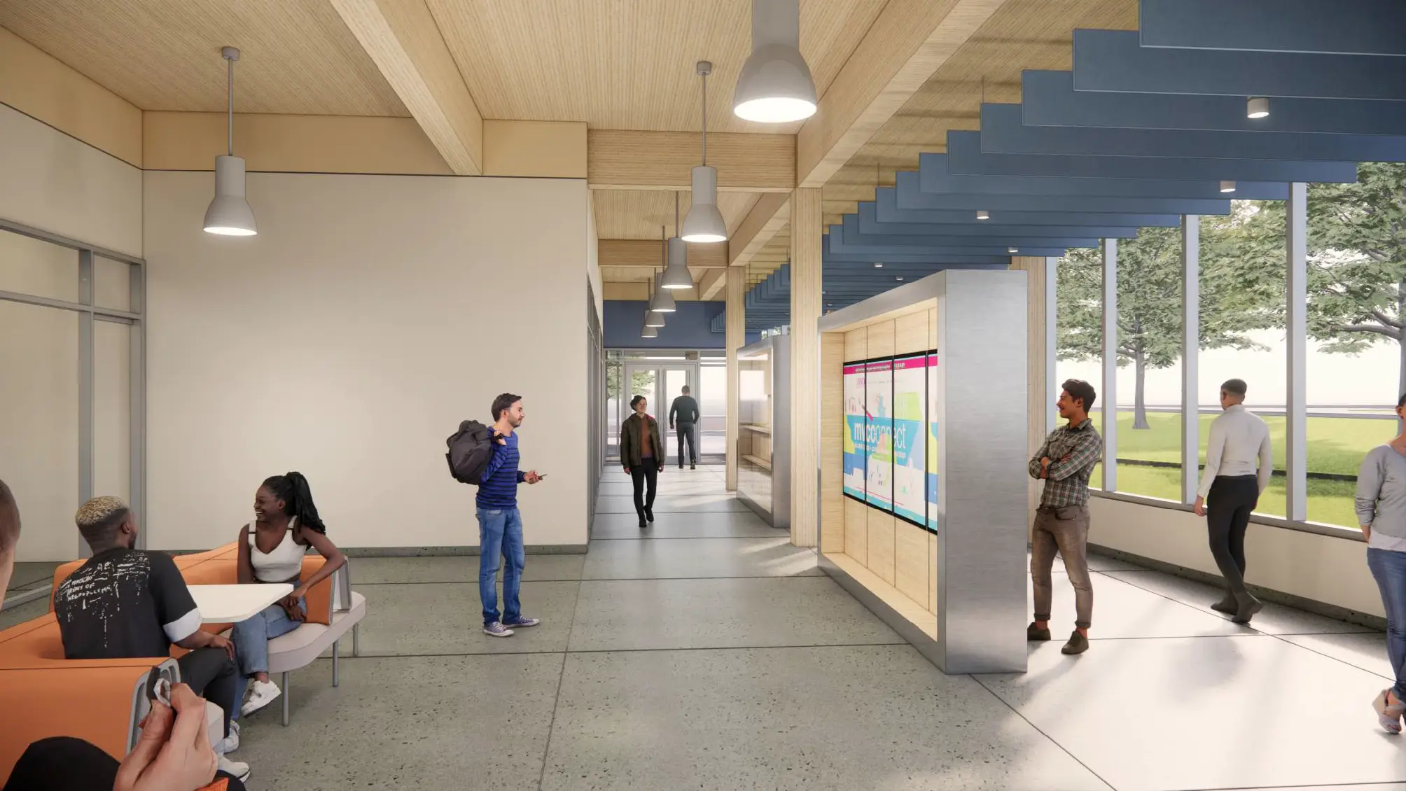 Three first-floor classrooms, two meeting rooms, breakout spaces, and multipurpose collaboration area with retractable partitions.